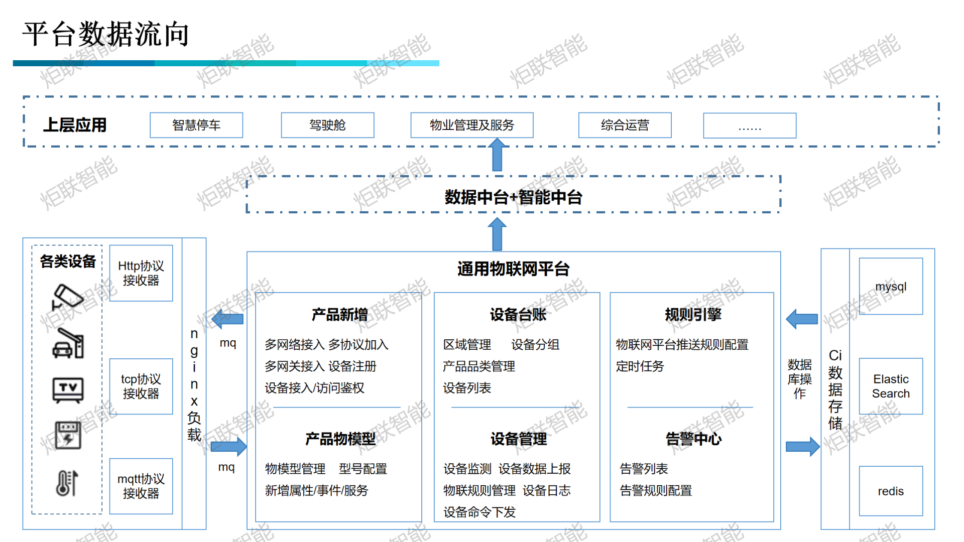 接入流程:建立产品及物模型——提供标准API接口——设备创建——数据解析——设备查看与应用