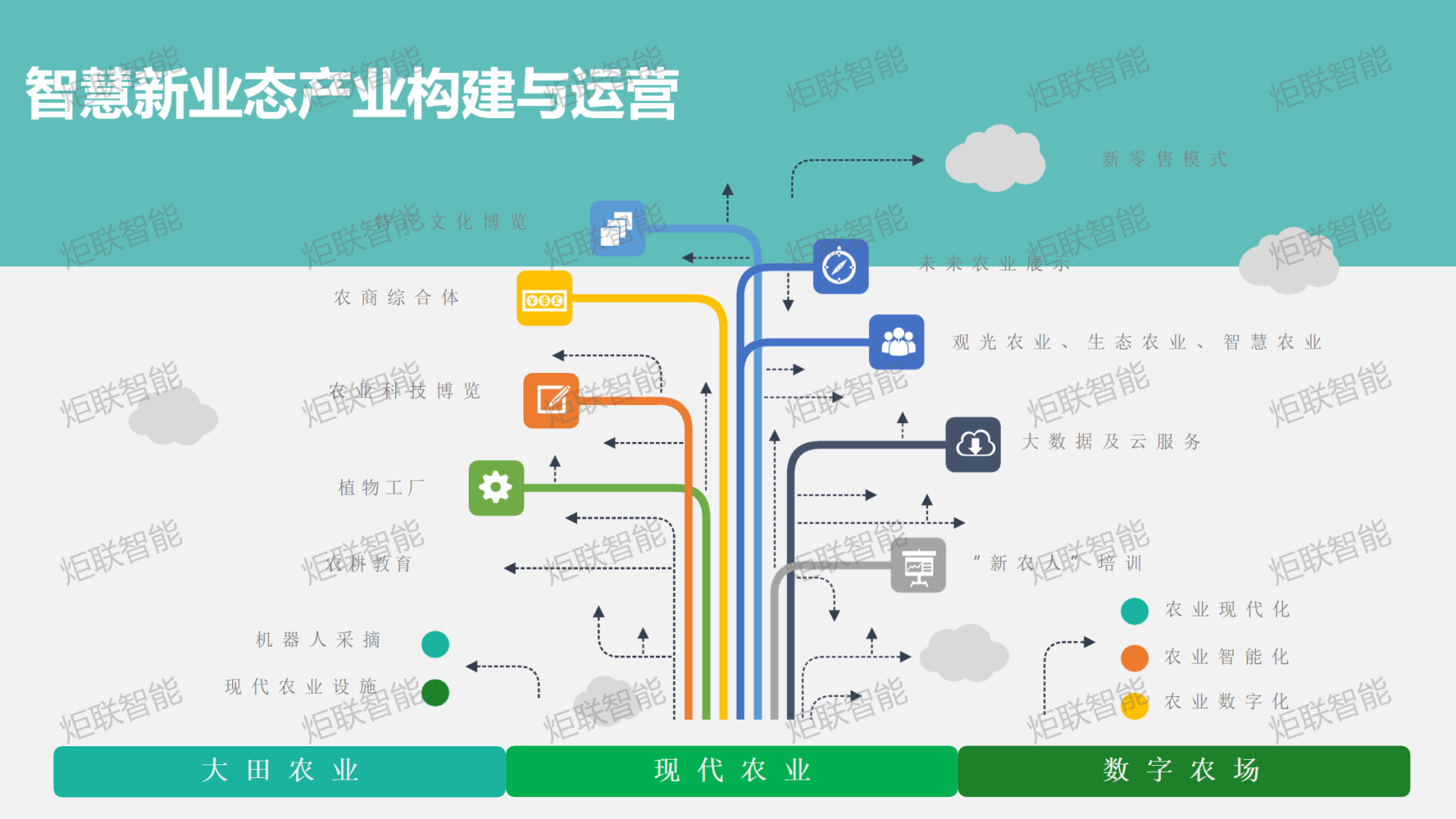 以区域智慧农业数字产销一体化产业互联网智慧平台为基础,打造国家农业公园,现代农业产业园区,康养、文旅、科技等特色小镇等多种业态产业项目。